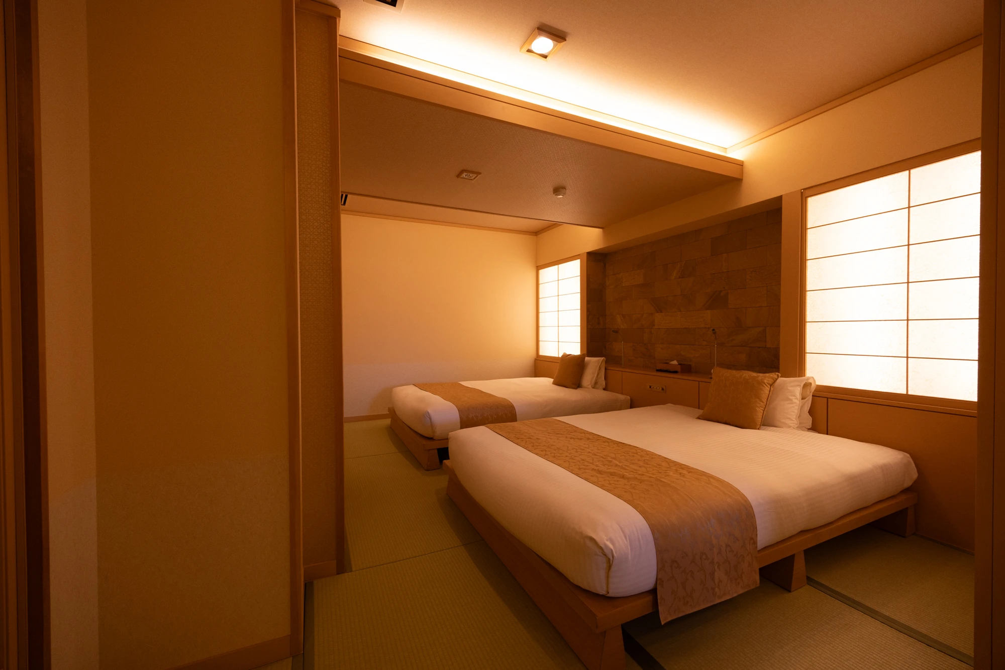 계절에 따라 변화하는 후지산의 모습을 노천탕에서 마음껏 즐길 수 있습니다. 넓고 편안한 12.5조의 화실과 아늑한 트윈룸. 침대는 편안한 잠자리를 약속하는 '시몬스' 제품. 커플부터 가족, 친구까지 즐길 수 있는 특별한 객실입니다.
