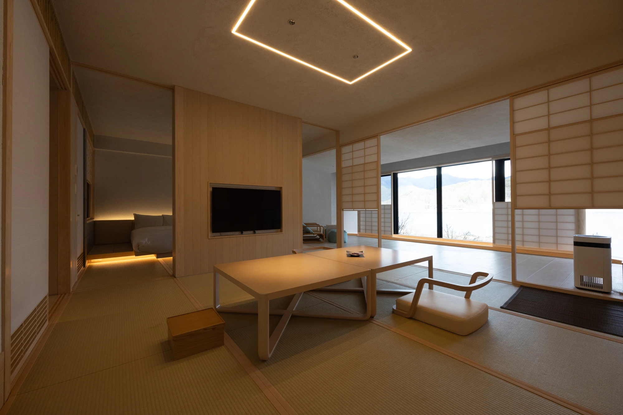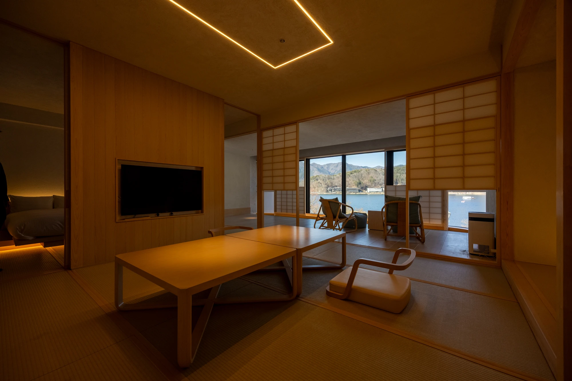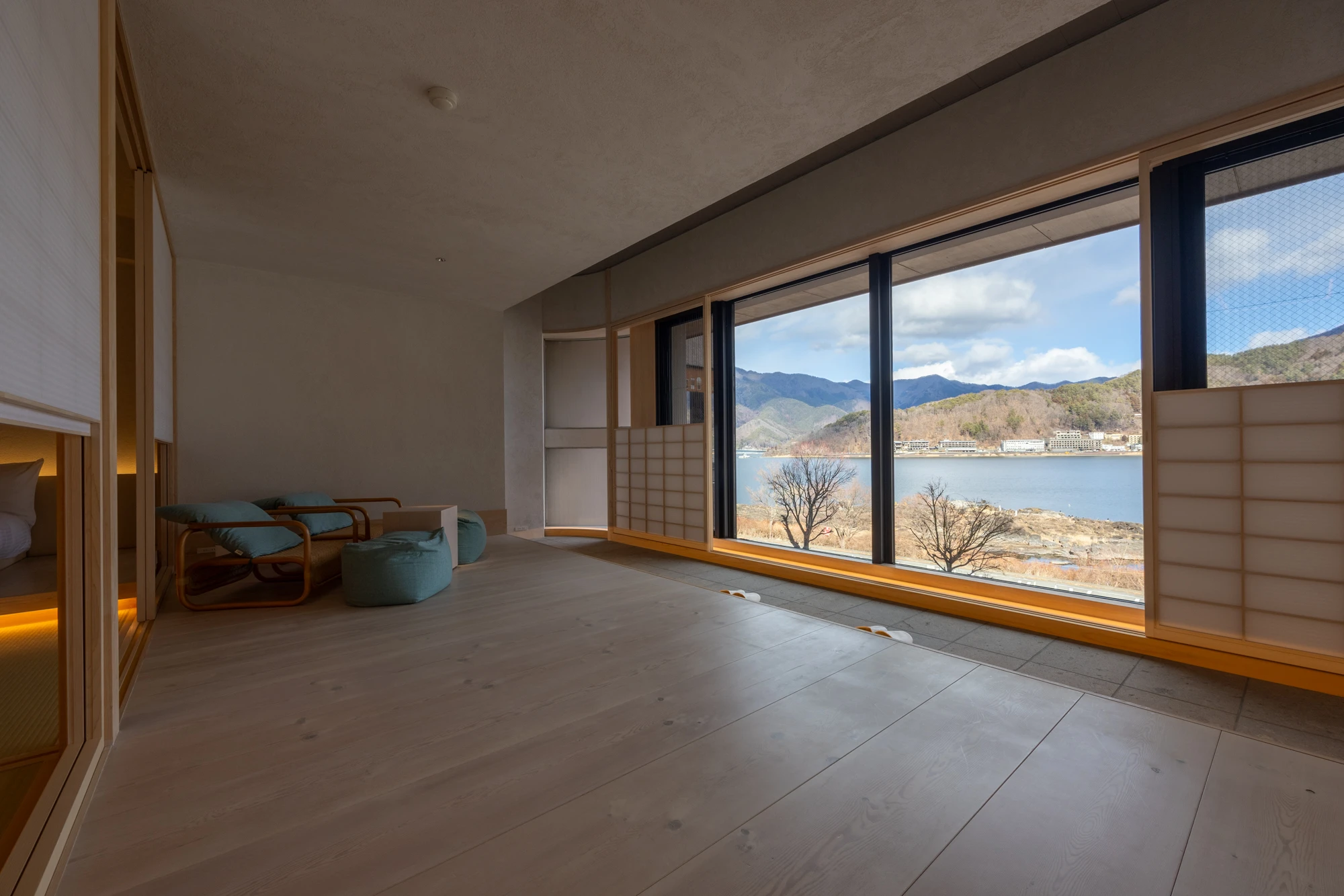 「庭屋一如」山と湖から庭と室内が ひと続きの自然と一体になった 「只々、湖を眺める為の客室」です。