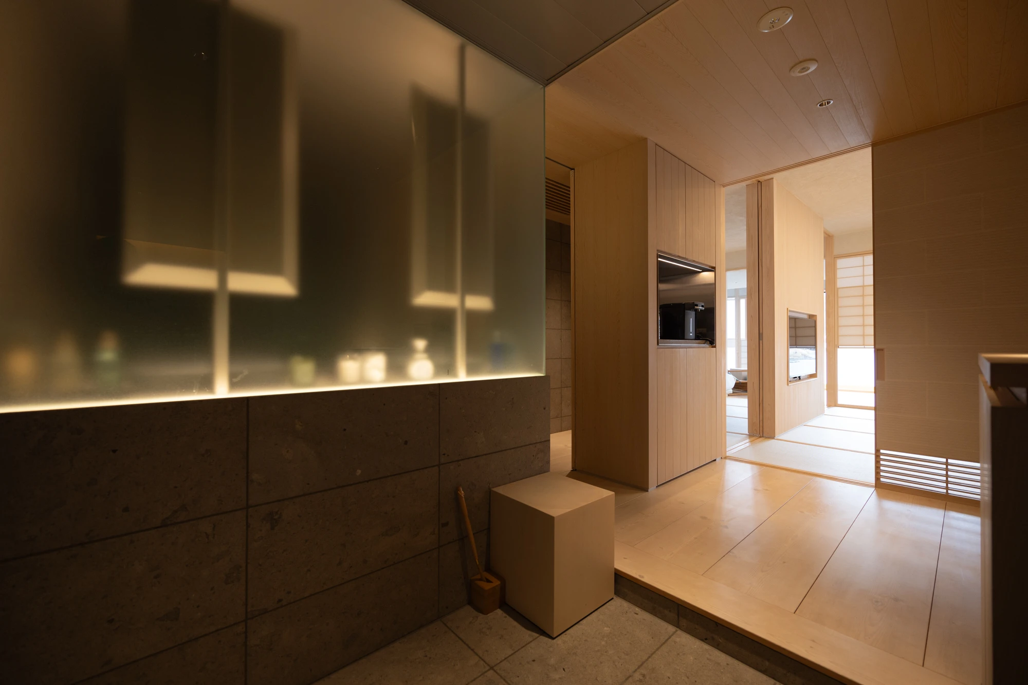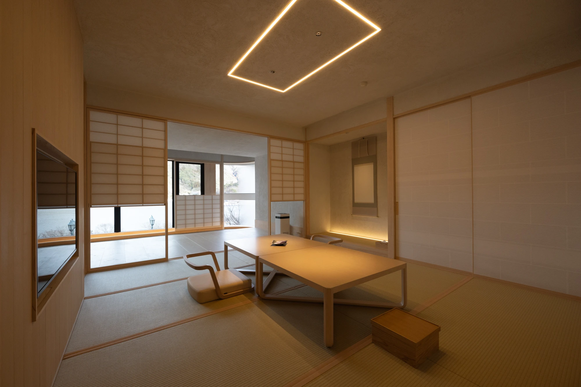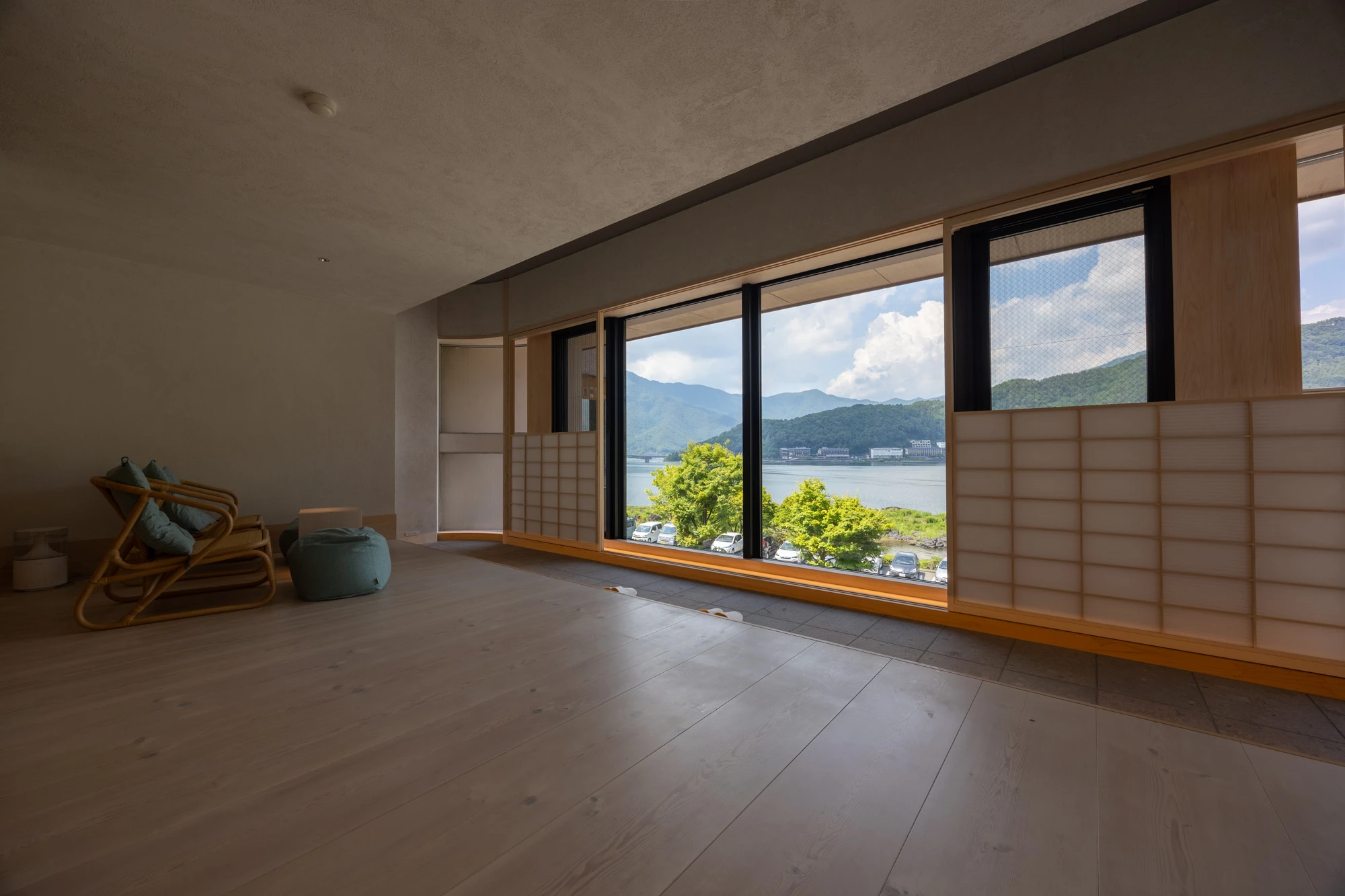 「庭屋一如」山と湖から庭と室内が ひと続きの自然と一体になった 「只々、湖を眺める為の客室」です。