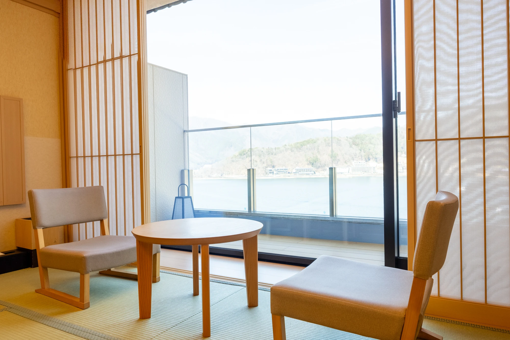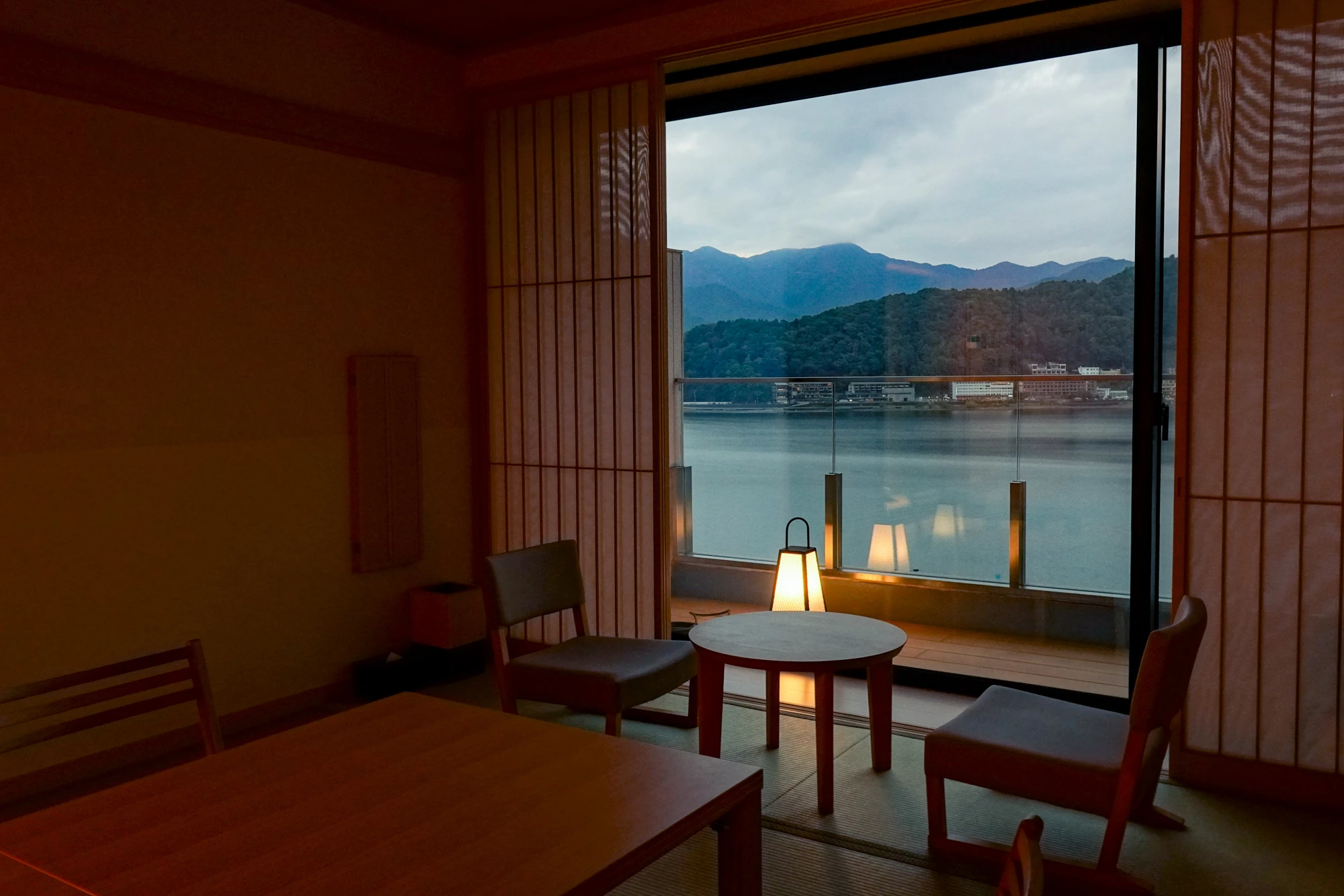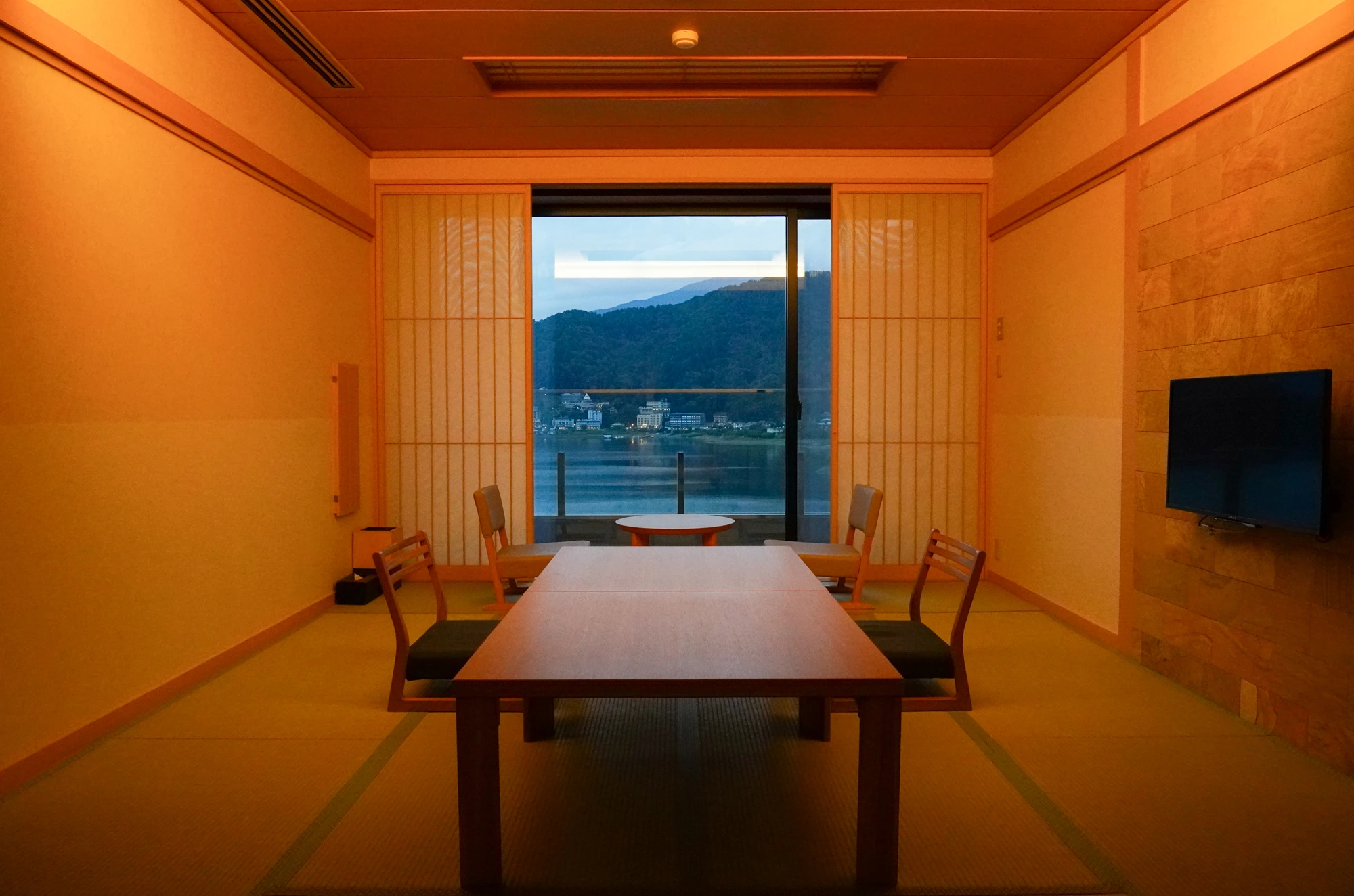 ひろびろとした12畳のお部屋からは河口湖の景色が広がります。